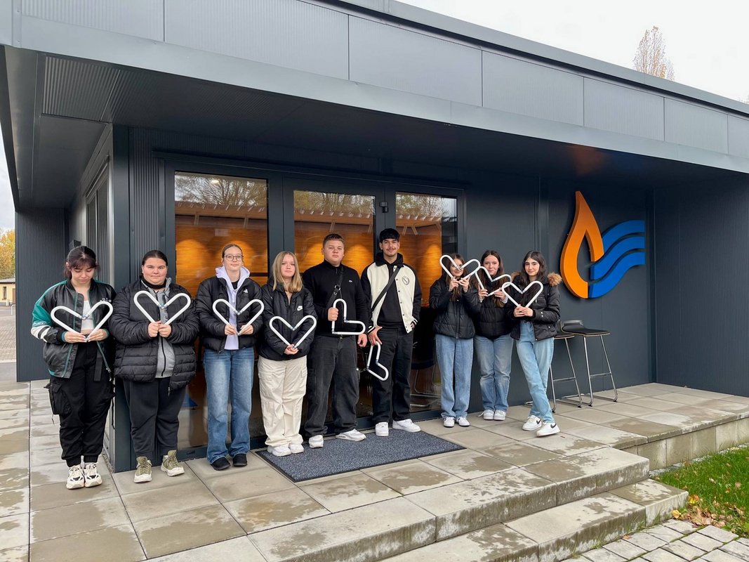 Handwerkliches Geschick war an diesem Tag auch gefragt. Das Ergebnis - ein Herz aus Wasserrohren. Zusammen mit technischen Mitarbeitern durften die Schüler das Rohr abmessen und abschneiden, biegen und am Schluss mit Verbinder zusammenpressen. Wir alle hatten viel Spaß dabei und waren am Ende des Tages happy über den Besuch.